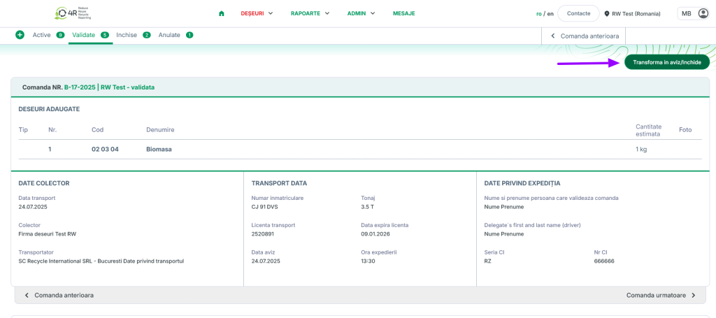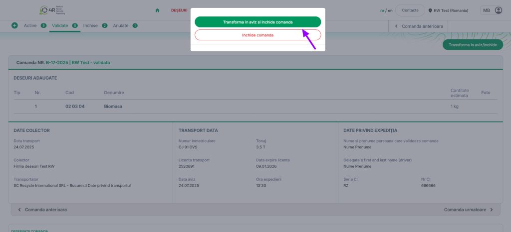 6.Apasa “Transforma in aviz” (se deschide o fereastra pop-up cu 2 butoane: Transforma in aviz sau Inchide comanda)