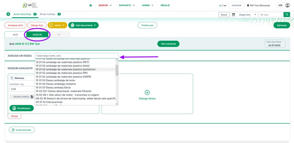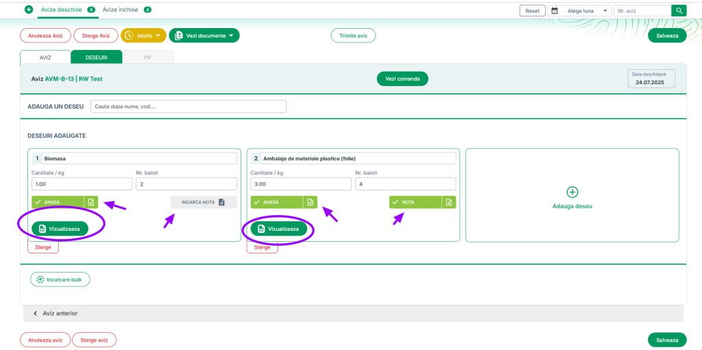 8.1 Se completeaza in tab-ul Deseuri datele corecte (deseu si cantitate), se incarca Anexa apasand pe butonul de sub cantitate (butonul Anexa devine verde) si se Salveaza
