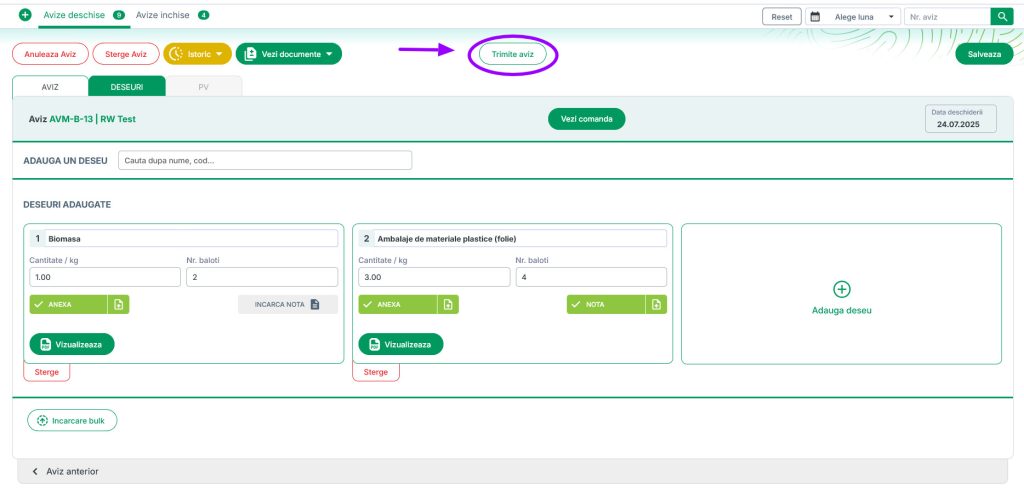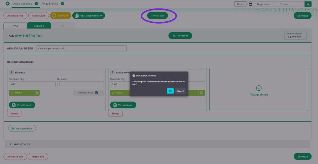8.2 Apasa Trimite Aviz si va aprea o casuta tip pop-up cu textul: Sunteti sigur ca au fost introduse toate tipurile de deseu in aviz?, se apasa OK